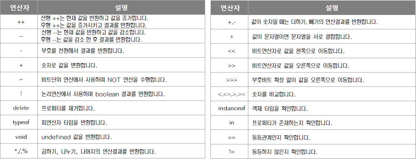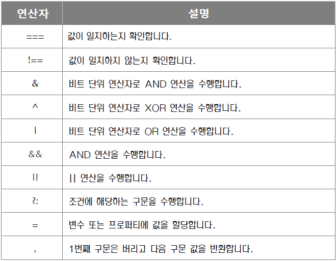 - 비교연산자 === : 두 값과 자료형이 같은지 비교 (모두 같아야 true) => Java나 C++에서의 ==과 같음