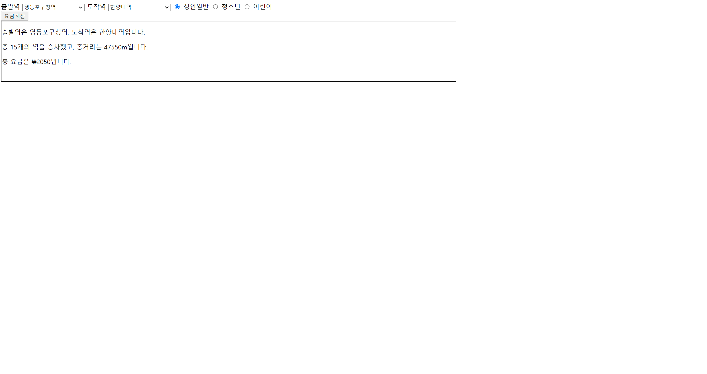 2. 요금 계산 버튼을 클릭하면, 출발역과 도착역 사이에 몇 개의 역이 있는지 계산한다.
