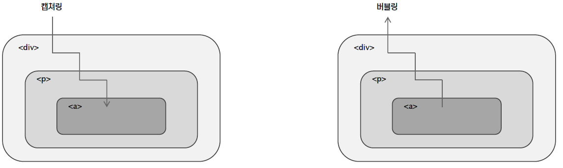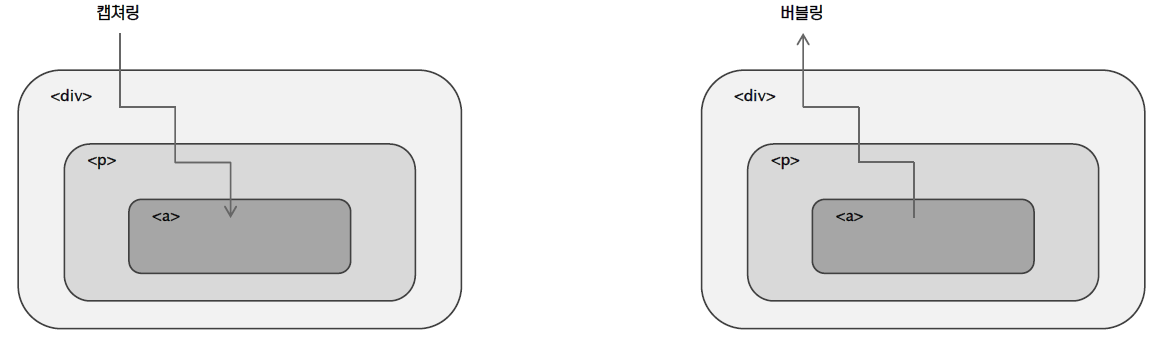 - 캡쳐링 : 이벤트가 발생한 요소를 포함하는 부모 HTML로부터 이벤트 근원지인 자식요소까지 검사하는 것