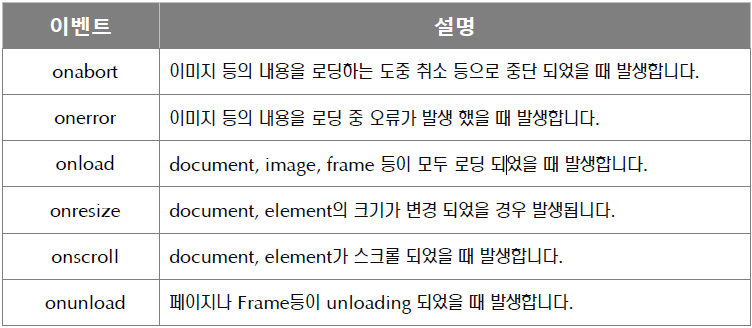 - onload : 문서 및 자원들이 모두 웹 브라우저에 적용되면 이벤트가 수행됨