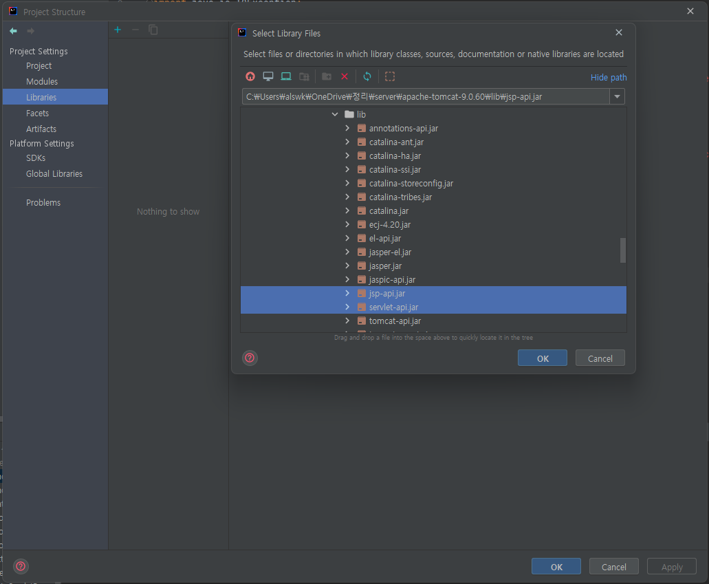 다운로드 되어있는 tomcat 폴더 내부 -> lib -> jsp-api.jar와 servlet-api.jar를 libraries에 추가