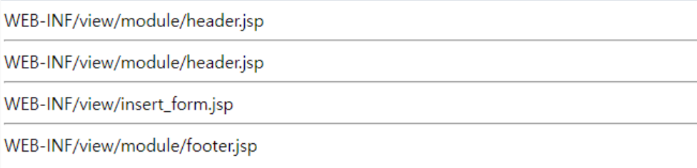 이 부분이 틀리니 xml 설정 과정에서 오류가 발생하여 WEB-INF폴더 내부의 jsp파일들을 아래와 같이 제대로 읽지 못했다. 아마 WEB-INF에 RequestForward 방식으로 접근이 안되어서 JSP내부 html을 읽지 못한다. 따라서 경로만 출력된다.