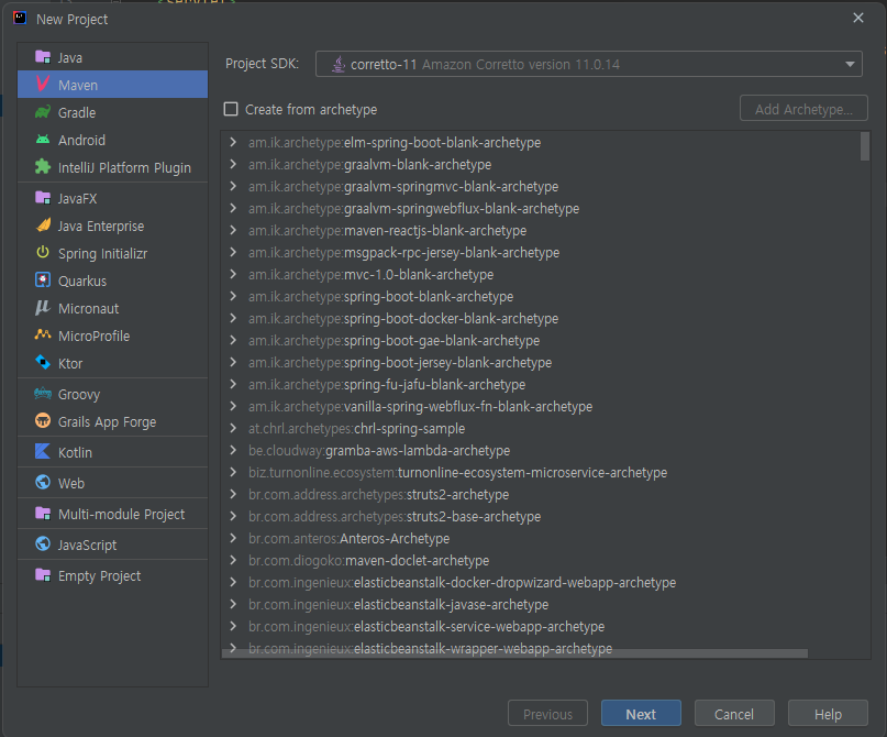 1. New Project 아래와 같이 Maven (Java ver.11)로 프로젝트 생성