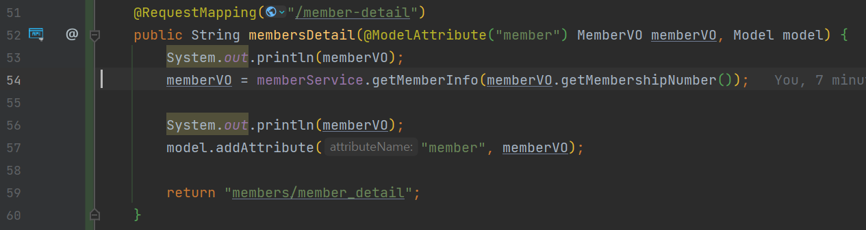 따라서, memberService를 통해 갱신한 memberVO는 model.addAttribute(line:57)를 통해 model에 등록해주어야함
